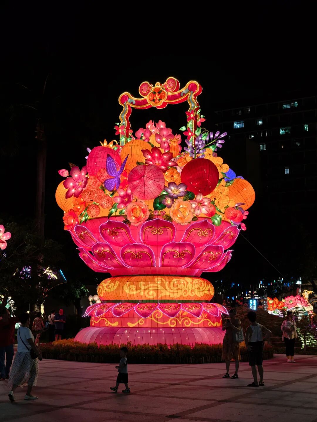 公园中心广场上,一个古典大花篮造型强力吸睛。灯组以鲜花与岭南佳果为创作主体,延续中式彩灯的典雅气韵,又以饱满的意象传递出双重美好寓意,璀璨夺目,令人驻足赞叹。灯组高达10米,彩灯匠人们采用“扎架塑形”的扎作工艺,将花篮的弧度、花瓣的层次、瓜果的轮廓扎作得精准细腻。