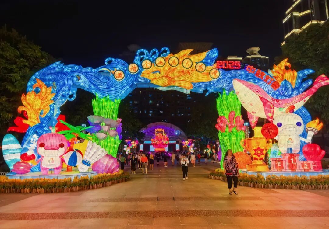 本届中秋灯会紧扣“喜迎十五运”主题,以《乘风破浪海天阔》为核心灯组,通过彩灯扎作工艺与现代灯光技术,呈现运动节奏与光影律动的视觉盛宴。